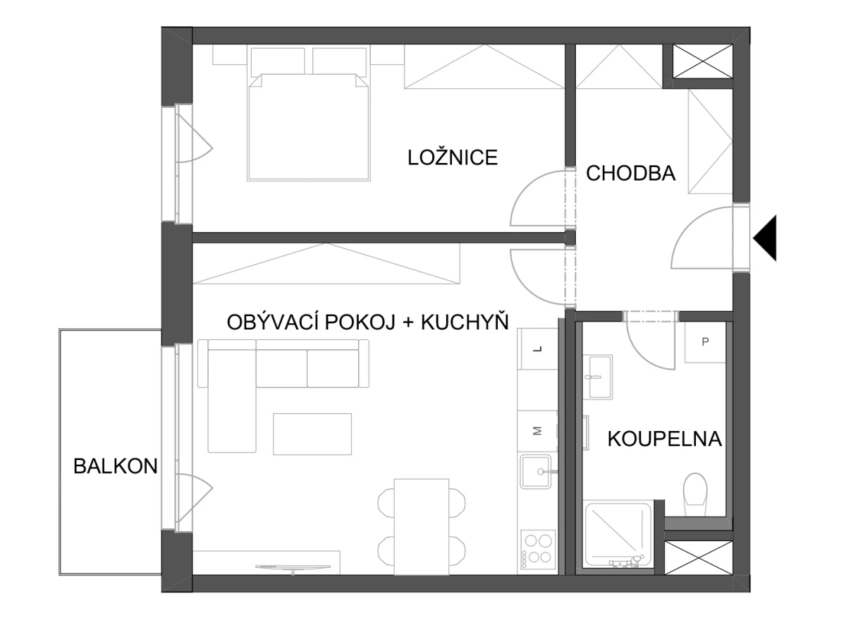 - Obývací pokoj + kuchyň 26.07 m2